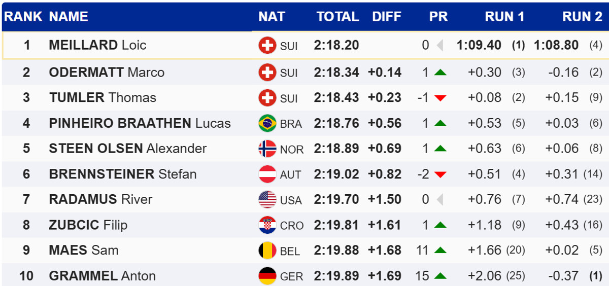 Для Мейяра це перша перемога на Кубку світу в поточному сезоні. Одерматту сьогоднішнє друге місце дозволило достроково забезпечити собі Малий Кубок світу в гіганті. Його найближчий переслідувач, норвежець Хенрік Крістофферсен, показав лише 16-й результат.