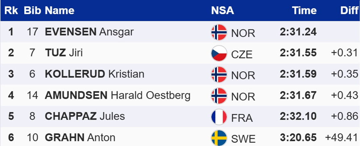 У фіналі Евенсен випередив чеха Іржі Туза та свого співвітчизника Крістіана Коллеруда. Для обох це перші подіуми на Кубку світу.