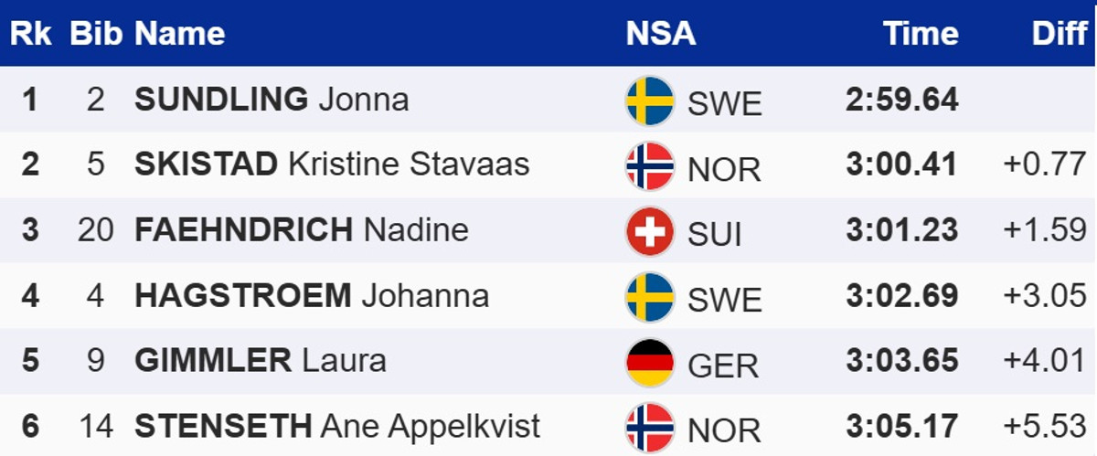 У жінок перемогу здобула шведка Йонна Сундлінг. У фіналі вона випередила господарку змагань, норвежку Крістін Шістад, і швейцарку Надін Фендріх.