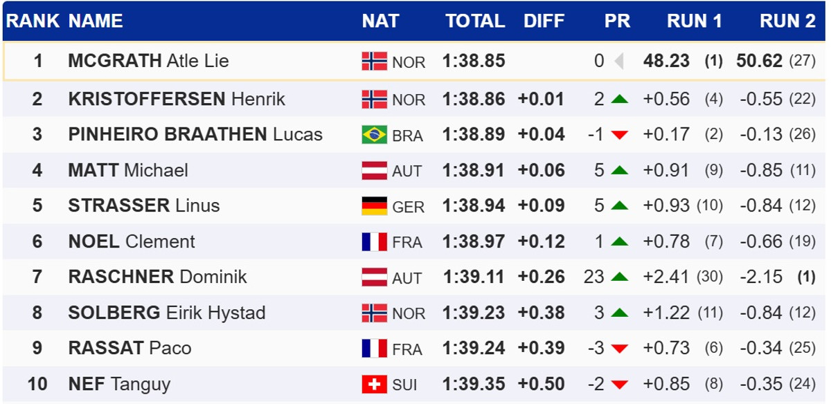 У Краньській Горі Макграт усього на 0,01 секунди випередив свого партнера по команді Хенріка Крістофферсена. Топ-3 замкнув бразилець Лукас Бротен, який напередодні виграв гігант.