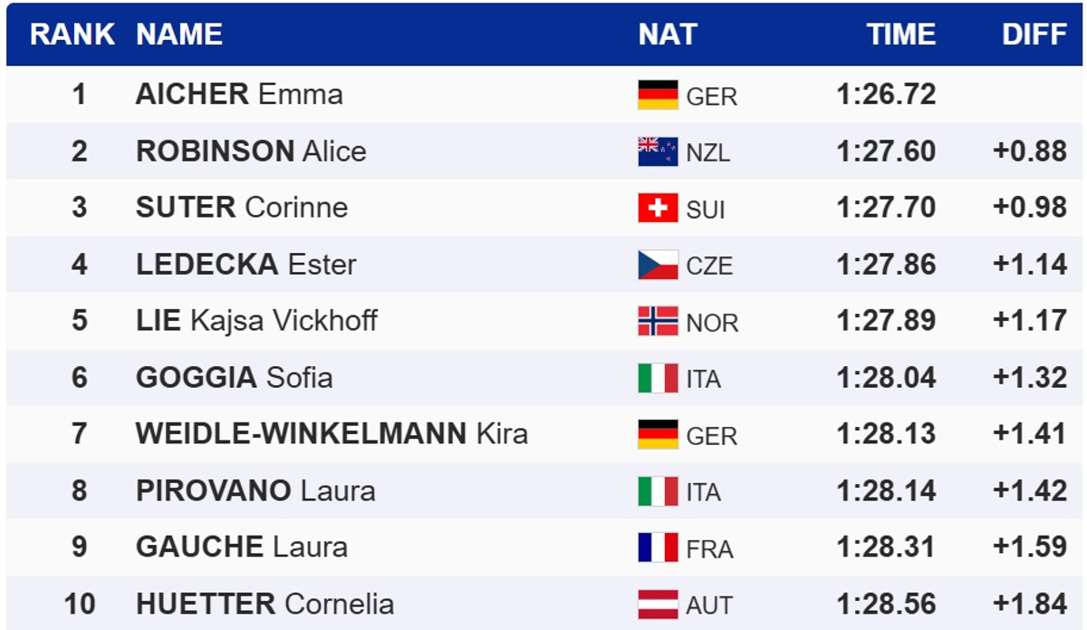 У Сольдеу німкеня здобула дуже переконливу перемогу, на 0,88 секунди випередивши новозеландку Еліс Робінсон. Топ-3 замкнула швейцарка Корінн Сутер, яка напередодні виграла швидкісний спуск.