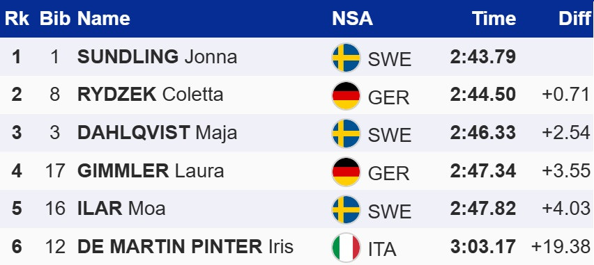 У жінок перемогу здобула чинна чемпіонка світу та олімпійська чемпіонка, шведка Йонна Сундлінг. У фіналі вона випередила господарку змагань, німкеню Колетту Ридцек, і свою партнерку по команді, Майю Дальквіст.