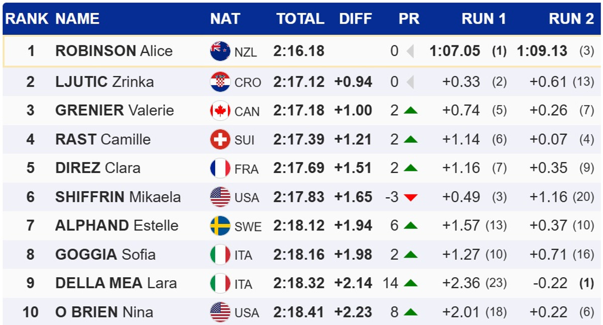 В Мон Тремблан Робінсон на 0,94 секунди випередила хорватку Зрінку Лютіч. Топ-3 замкнула господарка змагань, канадка Валері Граньє. Зіркова американка Мікаела Шиффрін у другій спробі відступила з третього на шосте місце.