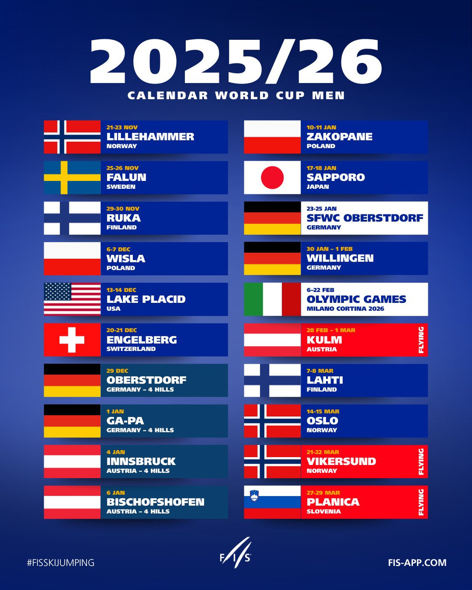 Окрім Турне чотирьох трамплінів (28 грудня – 6 січня), хайлайтами сезону стануть чемпіонат світу з польотів у німецькому Оберстдорфі (23 – 25 січня) та зимова Олімпіада-2026 (6 – 22 лютого), стрибкові змагання якої відбудуться у Валь ді Ф’ємме.