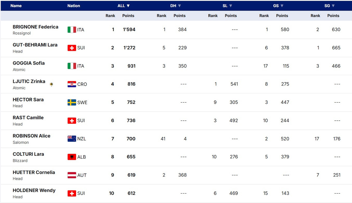 Дуже красномовна статистика, яка характеризує низький рівень конкуренції у сучасному жіночому гіганті. Ще кілька років тому саме в цій дисципліні у жінок був найвищий рівень конкуренції, проте завершення кар’єри Тесси Ворлі та Рагнхільд Мовінкель, відсутність Мікаели Шиффрін і спад Марти Бассіно призвели до того, що оптимально готову Бріньоне обіграти практично неможливо – лише в разі грубої помилки. Хоча це не привід заперечувати той очевидний факт, що італійка провела найкращий сезон у своїй кар’єрі.