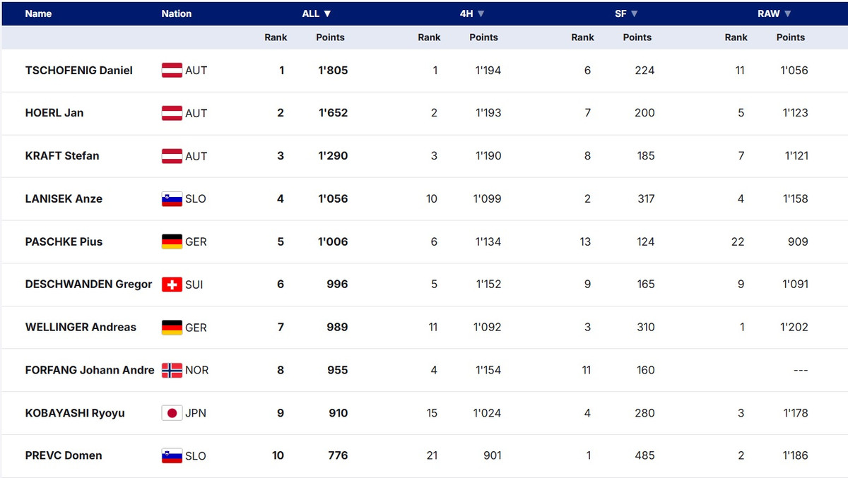 Веллінгер у п’ятницю замкнув топ-6, а в неділю піднявся на подіум. П’юс Пашке не найкращим чином виступив у командному турнірі, проте в обох особистих потрапив у топ-10 – 10 і 6 місця. П’юс під кінець сезону явно вийшов із глибокого спаду форми, та й його дуже суттєва змінена техніка відштовхування з більш низькою траєкторією польоту на гігантських трамплінах працює значно краще, ніж те, як П’юс стрибав протягом майже всієї своєї кар’єри.