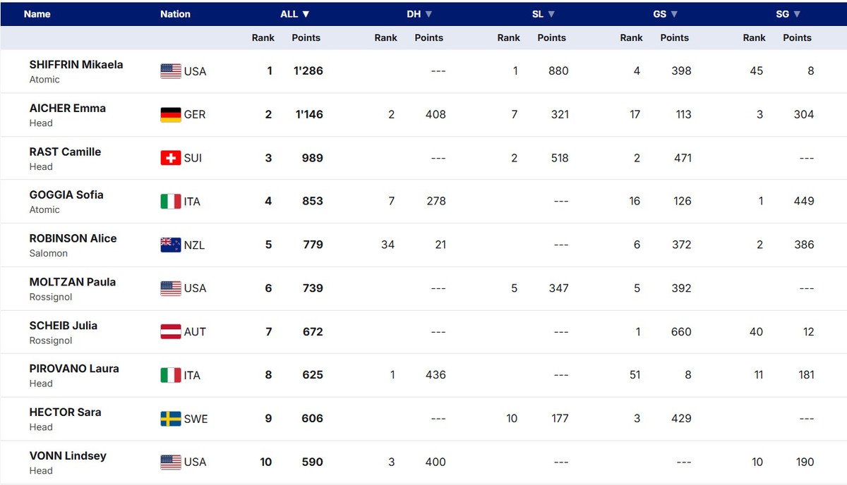 Що стосується Мікаели Шиффрін, то у слаломі вона знову розгромила суперниць, вигравши у Айхер 0,94 секунди. Проте від того, чи привозиш ти своїй суперниці 1 секунду, чи 0,01 секунди, нічого не змінюється: якщо вона фінішувала другою, то ти виграла у неї всього 20 очок. А днем раніше в гіганті американка Еммі несподівано програла, посівши 5 місце.