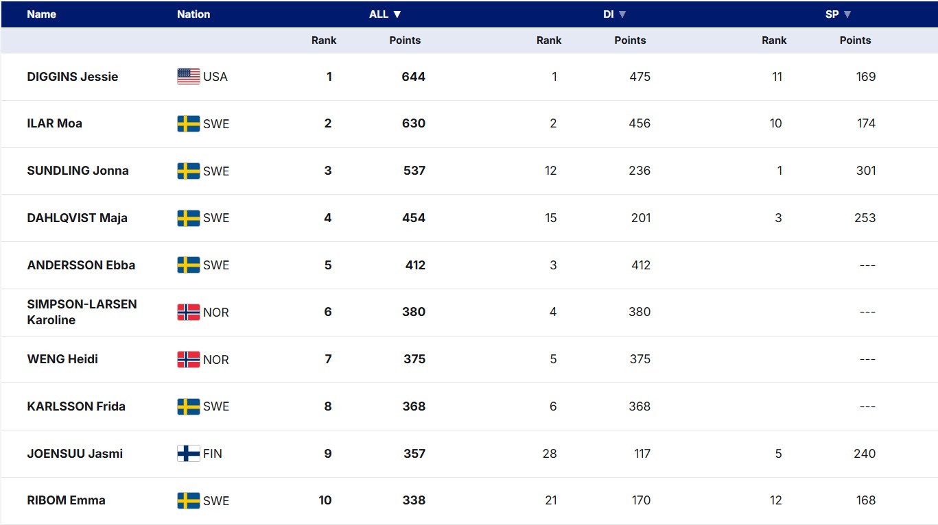 Другою стала Моа Ілар, яка напередодні в спринті вилетіла вже на стадії чвертьфіналу. Шведка продовжує боротьбу з Джессікою Діггінс у загальному заліку Кубку світу, та у Давосі відіграла у американки декілька важливих очок. Джесс у спринті також вилетіла в чвертьфіналі, а ось у розділці посіла лише 5 місце. Наразі в загальному заліку Кубку світу двох дуелянток розділяють усього 14 очок.