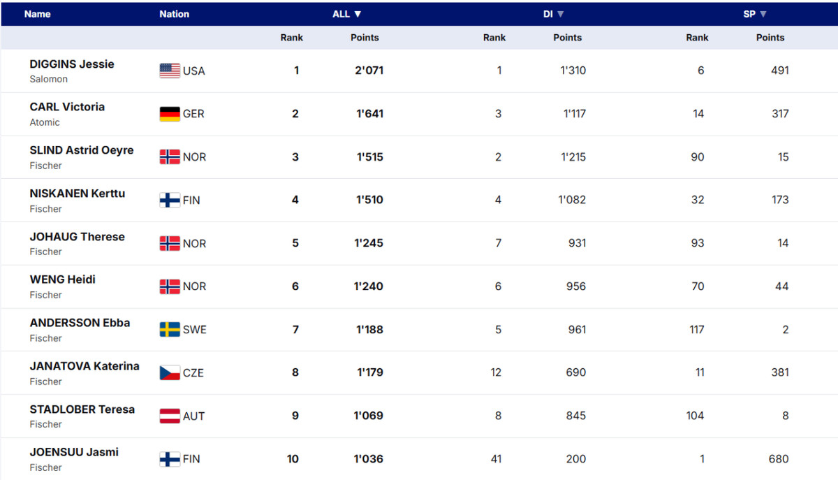 Форма Джессіки Діггінс під кінець сезону явно пішла на спад, хоча сама американка у своїх невдалих виступах на чемпіонаті світу звинувачує сервісменів. У Холменколлені вона посіла 10 та 6 місця. Сам факт того, що у суботу вона вийшла на старт 20-кілометрової розділки класикою, говорить про те, що травма стопи залишилася позаду. Нехай навіть результати зіркової американки в Холменколлені не вразили, проте їх виявилося достатньо для того, щоб достроково завоювати свій третій у кар’єрі ВКГ.