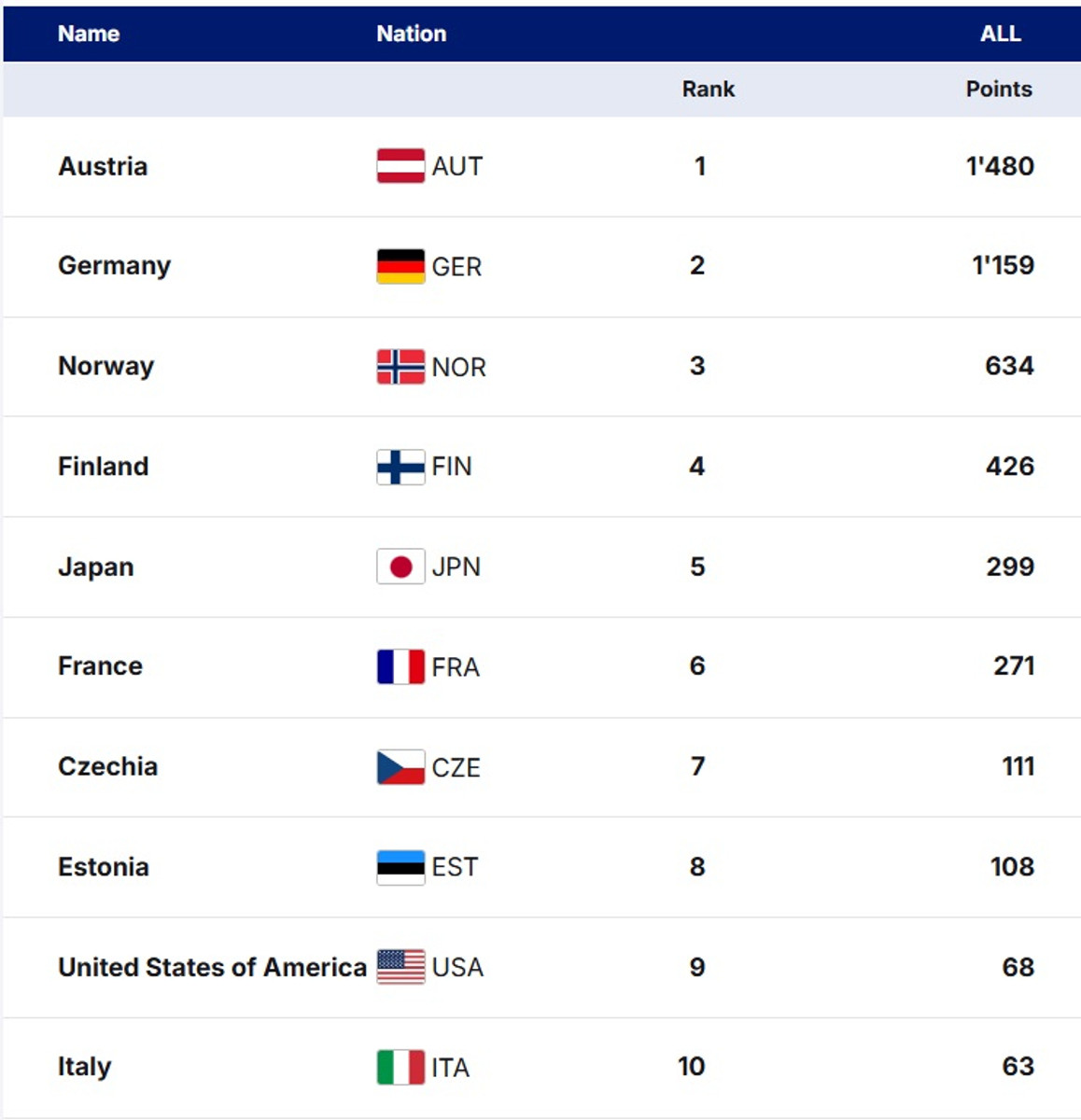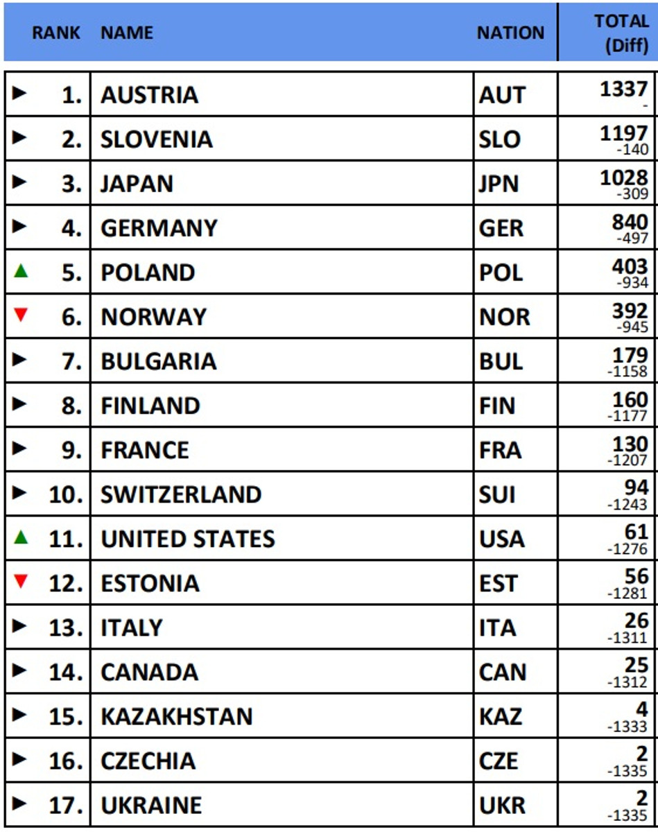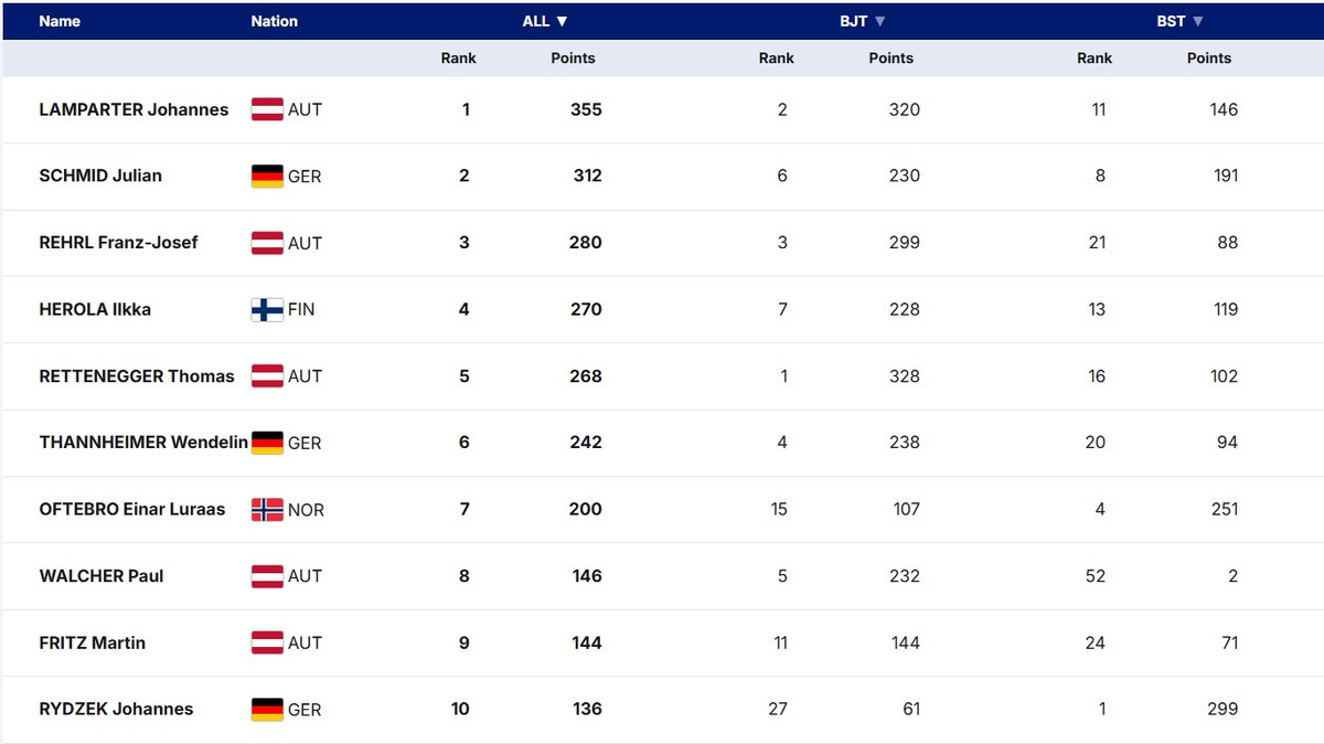 Прірва в рівні між двома лідерами збірної Німеччини та Гайгером і Веллінгером зараз просто величезна, і заповнює її лише П'юс Пашке, який продовжує стабільно набирати очки – 17 і 12 місця. Втім, усі ми пам'ятаємо, що він є яскраво вираженим "декабристом", тому в січні цілком може доєднатися до двох інших іменитих ветеранів.