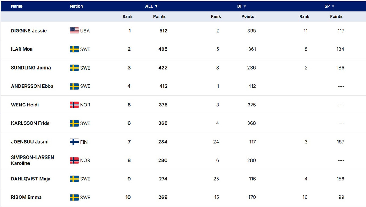 Що стосується Ілар, то вона добралася до півфіналу спринта та стала четвертою в скіатлоні. На даний момент саме Моа виглядає головною (якщо не єдиною) конкуренткою Діггінс у боротьбі за Великий кришталевий глобус (ВКГ). Шансів на особисті медалі на Олімпіаді-2026 у шведки небагато, тому вона абсолютно резонно робить ставку на Кубок світу, де наразі програє Діггінс лише 17 очок.