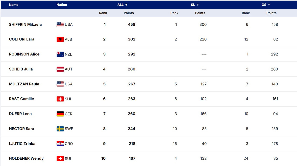 Мікаелі Шиффрін така ж обережна тактика в суботу принесла третій результат у першому раунді. Проте в другому раунді проблема американки з другими спробами в гіганті знову проявилася, і Мікі відступила на 6 позицію. В неділю вона виступила краще, розділивши 4 місце з Каміль Раст. В цілому непоганий вікенд для Шиффрін, чия форма в гіганті викликали багато побоювань, особливо після скромного 14 місця на домашньому етапі в Коппер Маунтін. Проте факт залишається фактом: останній подіум Мікаели в гіганті датований ще січнем 2024 року.