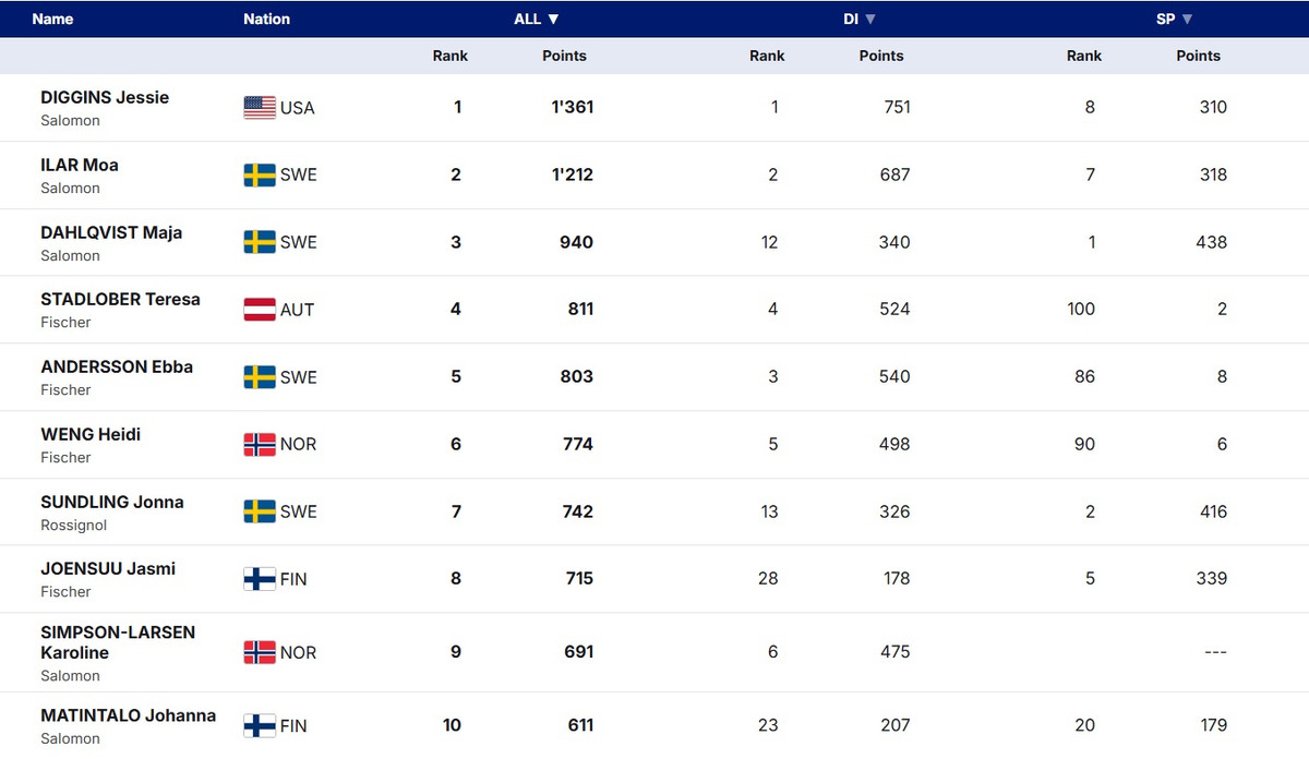 На контрасті з американкою дуже сильний етап провела головна (а по суті – єдина) конкурентка в загальному заліку, Моа Ілар. У спринті вона дісталася фіналу та посіла в підсумку п'яте місце, а в неділю виграла розділку. Це допомогло шведці наблизитися до Діггінс на відстань 149 очок у Кубку світу. За сучасної очкової системи – відставання все ще велике. Проте недостатньо велике, щоби Джессіка могла дозволити собі пропустити наступний етап у Гомсі задля кращої підготовки до Олімпіади.