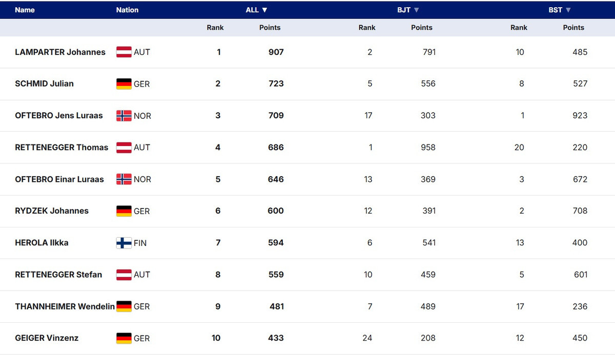 Збірна Німеччини без подіуму на домашньому етапі не залишилася – у неділю Юліан Шмід виграв спринт за 3 місце у Лампартера. Втім, у суботньому компакті Юліан невдало виступив на трампліні (лише 12-й результат), і в підсумку став лише дев'ятим – відставання від Лампартера у загальному заліку продовжує зростати.