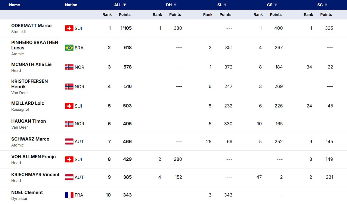 Четверта перемога (при чому, поспіль) Одерматта в даунхіллі на "Лауберхорні": він став рекордсменом за цим показником, випередивши таких легенд, як Беат Фойц і Франц Кламмер. Утім, тут слід пам'ятати, що в 2024 році Марко виграв у Венгені двічі – тоді до програми етапу додали ще один швидкісний спуск, перенесений із Бівер Кріка.