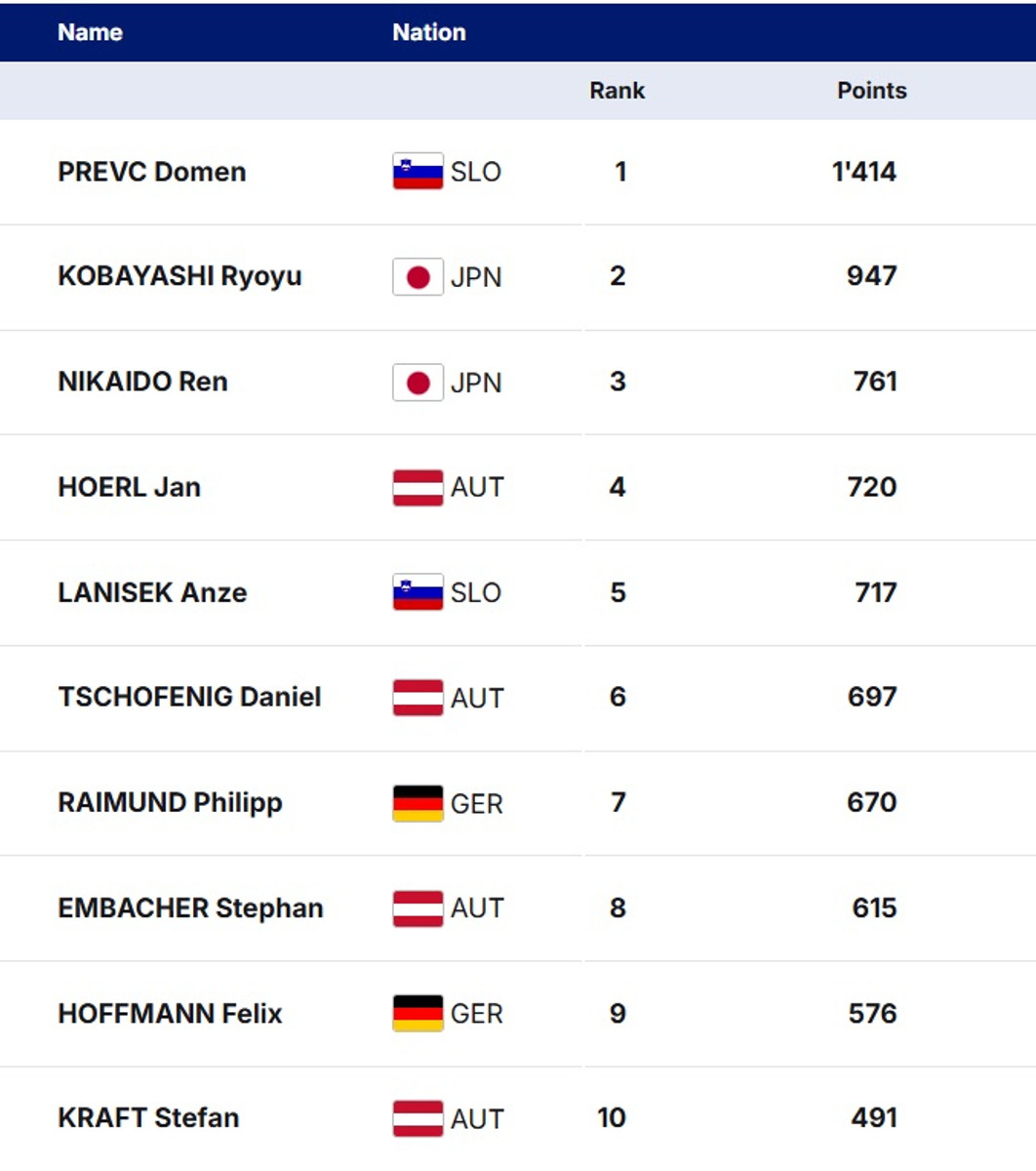 При чому, в суботу словенець розгромив своїх суперників, вдруге у поточному сезоні привізши найближчому переслідувачу понад 20 балів. При чому, після першої спроби Превц ішов лише другим, програючи 1,3 бала Яну Хьорлю. Проте феноменальний політ на 141 метр у другому раунді просто нокаутував усіх суперників словенця.