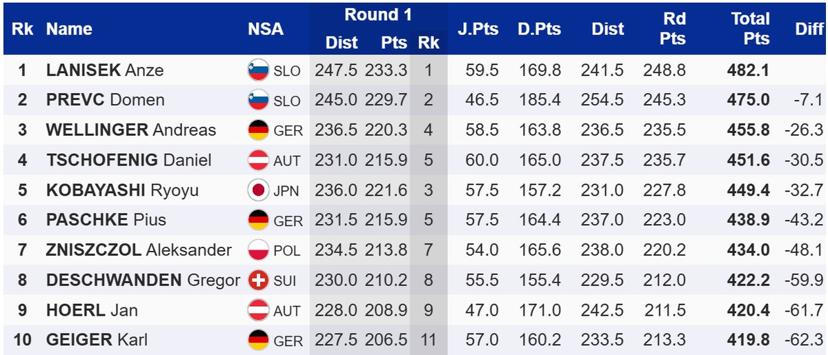 Він на 7,1 бала випередив свого партнера по команді Домена Превца, який у другій спробі встановив новий рекорд світу – 254,5 метри. Топ-3 замкнув німець Андреас Веллінгер. Свіжоспечений володар Кубку світу, австрієць Даніель Чофеніг, посів четверте місце.