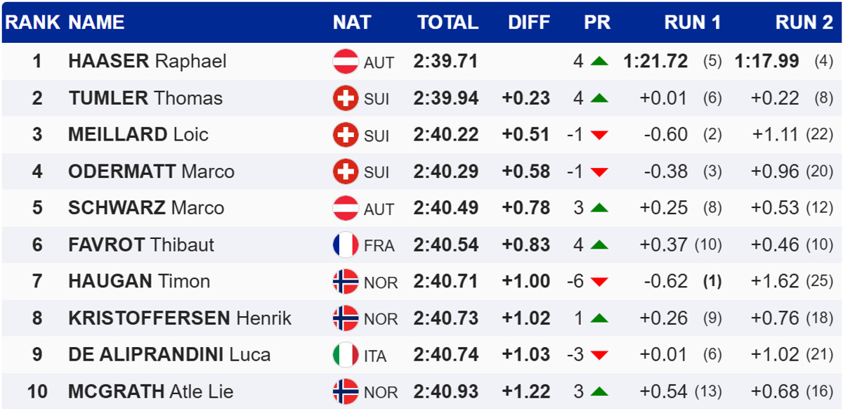 Головний фаворит старту, Марко Одерматт, захистити свій чемпіонський титул не зумів і посів у підсумку лише четверте місце.