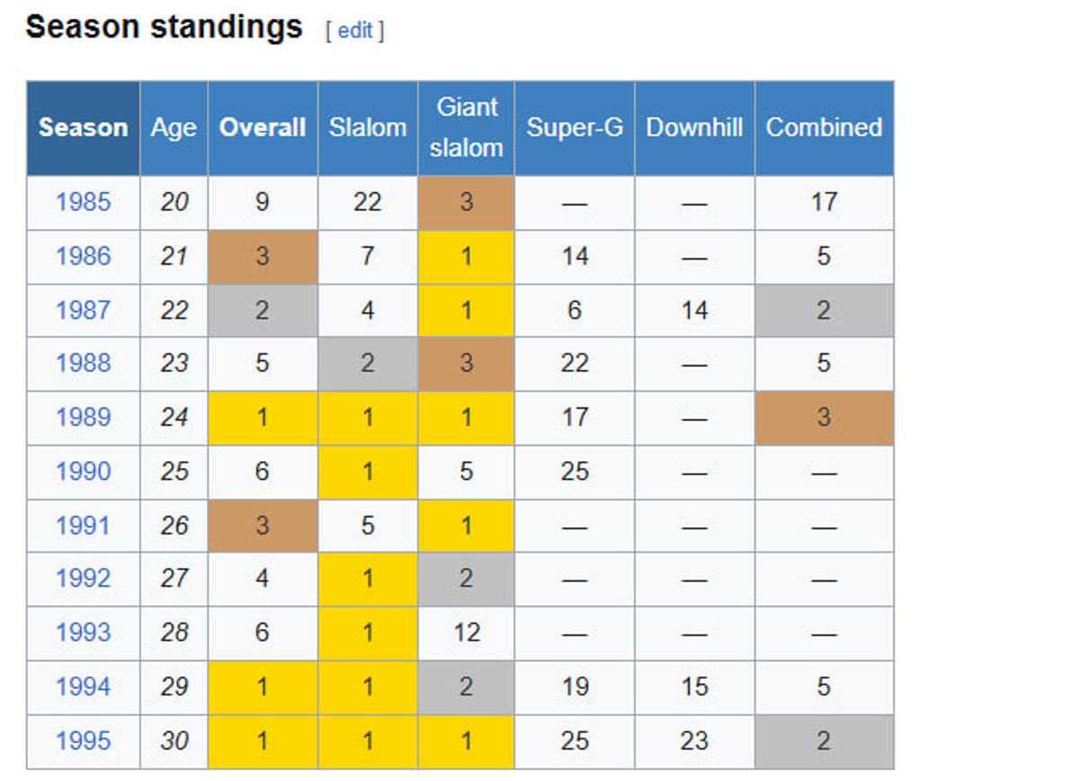 - Кількість перемог на етапах Кубку світу: 102