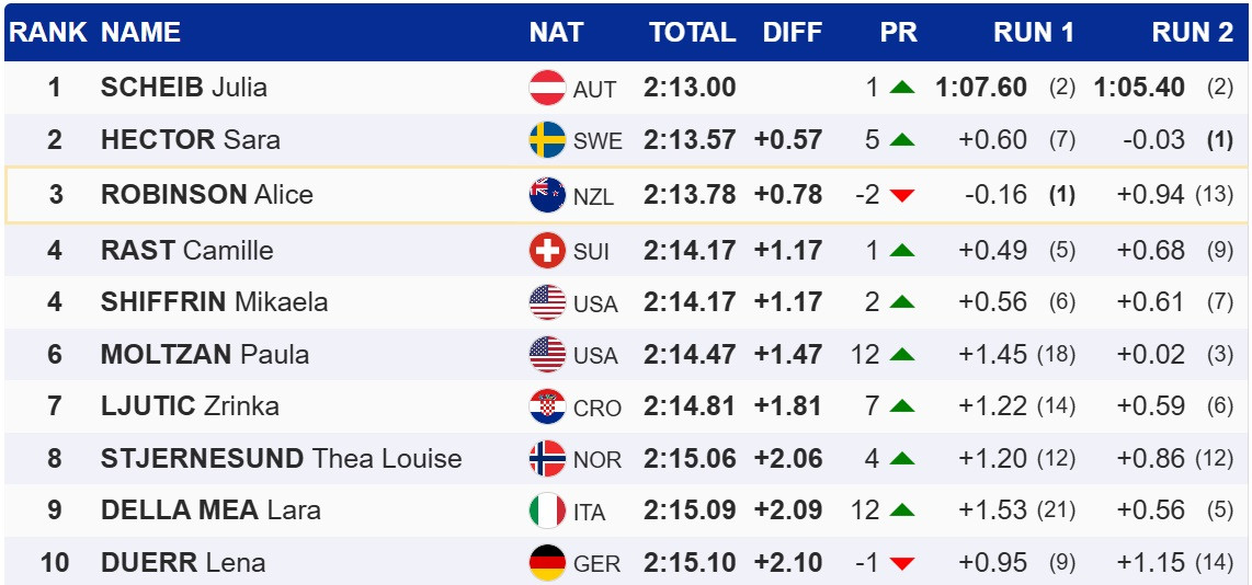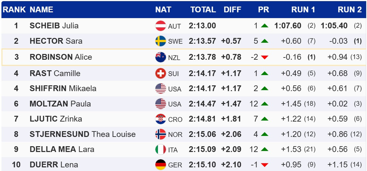 Шайб на 0,57 секунди випередила шведку Сару Хектор, яка у другій спробі прорвалася з 7 місця на подіум. Топ-3 замкнула переможець вчорашнього гіганту, новозеландка Еліс Робінсон, яка не зуміла втримати лідерство після першого раунду.