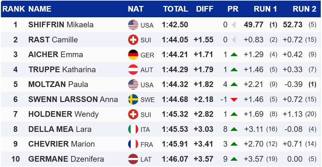 У Куршевелі Шиффрін вкотре розгромила своїх суперниць, випередивши найближчу переслідувачку, швейцарку Каміль Раст, на 1,55 секунди. Компанію на подіумі їм склала німкеня Емма Айхер, яка минулої суботи (13 грудня) виграла другий швидкісний спуск у швейцарському Санкт Моріці.
