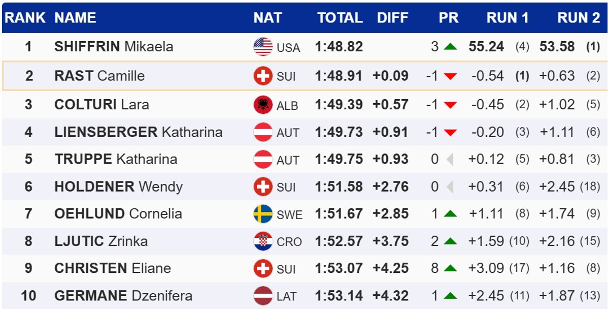 У Земмерінгу Шиффрін йшла лише четвертою після першої спроби, і в підсумку лише на 0,09 секунди випередила чинну чемпіонку світу, швейцарку Каміль Раст, яка не втримала лідерство після першої спроби. Топ-3 замкнула албанка Лара Кольтурі.