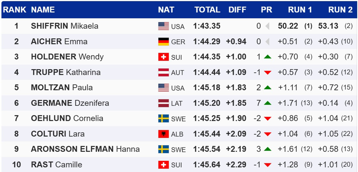Шиффрін на 0,94 секунди випередила свою головну суперницю по загальному заліку Кубку світу, німкеню Емму Айхер, яка посіла друге місце. Топ-3 замкнула швейцарка Венді Холденер.
