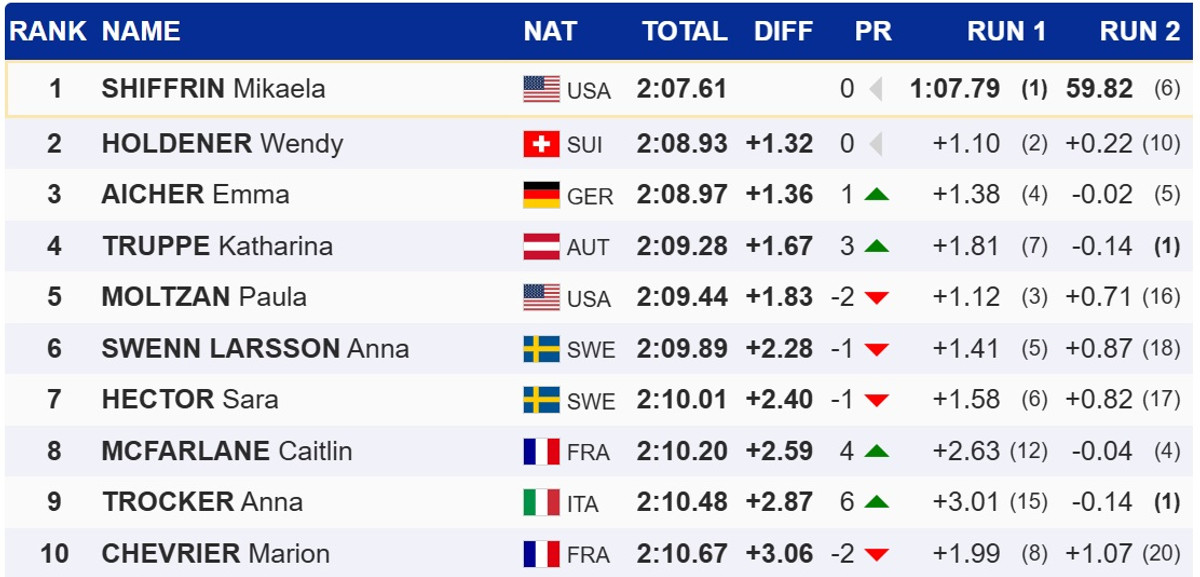 Топ-3 замкнула німкеня Емма Айхер, що не дозволило Шиффрін достроково завоювати Великий кришталевий глобус. Розрив між ним збільшився до 85 очок. Для того, щоби обійти американку, Айхер потрібно вигравати гігант і сподіватися на те, що Шиффрін зійде з дистанції або фінішує нижче за 15 місце.