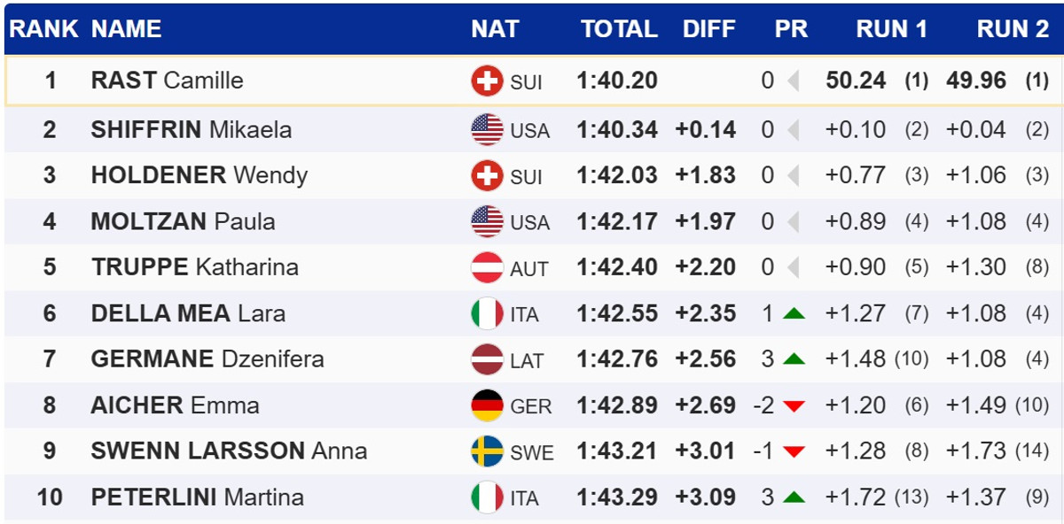 У слаломі Раст зуміла перервати серію Мікаели Шиффрін із шести перемог поспіль у слаломі на Кубку світу, випередивши легендарну американку на 0,14 секунди. Топ-3 замкнула партнерка Раст по збірній Швейцарії, Венді Холденер.