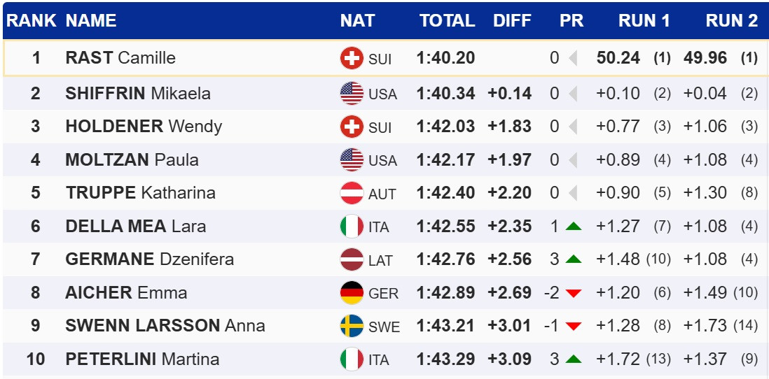 У слаломі Раст зуміла перервати серію Мікаели Шиффрін із шести перемог поспіль у слаломі на Кубку світу, випередивши легендарну американку на 0,14 секунди. Топ-3 замкнула партнера Раст по збірній Швейцарії, Венді Холденер.