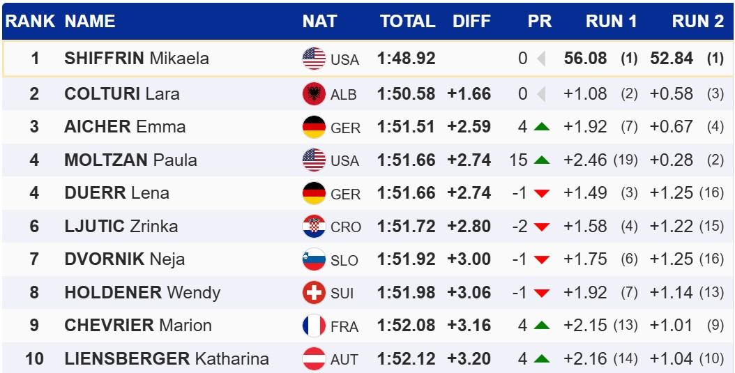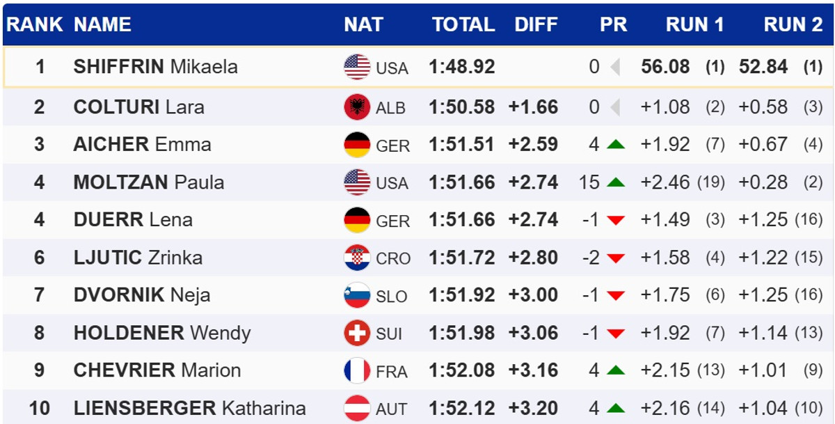 Шиффрін на 1,66 секунди випередила свою найближчу переслідувачку, Лару Кольтурі, яка представляє Албанію. Топ-3 із відставанням у 2,59 секунди замкнула німкеня Емма Айхер, для якої це перший у кар'єрі подіум на Кубку світу в слаломі.