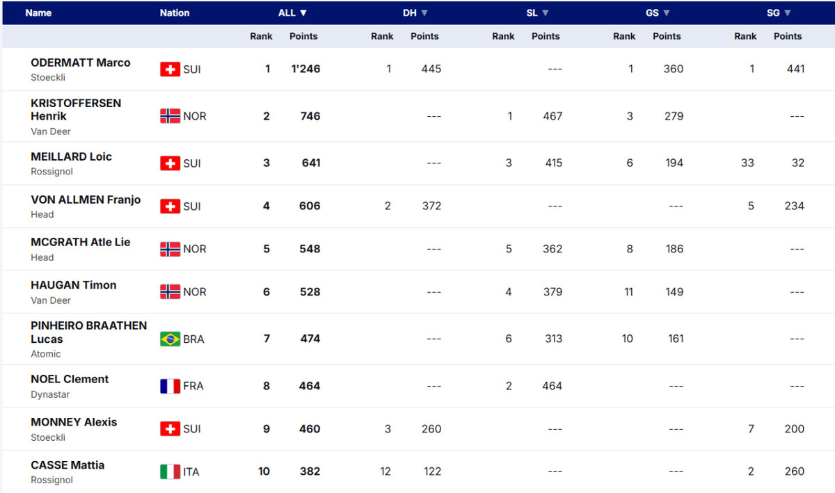 Як би там не було, етап у Кранс Монтані перетворився на справжній бенефіс господарів, збірної Швейцарії, яка за два дні забрала 5 призових місць із 6 можливих. У обох стартах на подіум піднялися Марко Одерматт і Алексіс Монне. Останній у Кранс Монтані залишився без перемоги, а ось Одерматт після другого місця в суботньому швидкісному спуску в неділю виграв супергігант. Тим самим, Марко майже забезпечив собі Малий Кубок світу в цій дисципліні: за два старти до завершення сезону він випереджає найближчого переслідувача, Маттіа Кассе, на 181 очко.