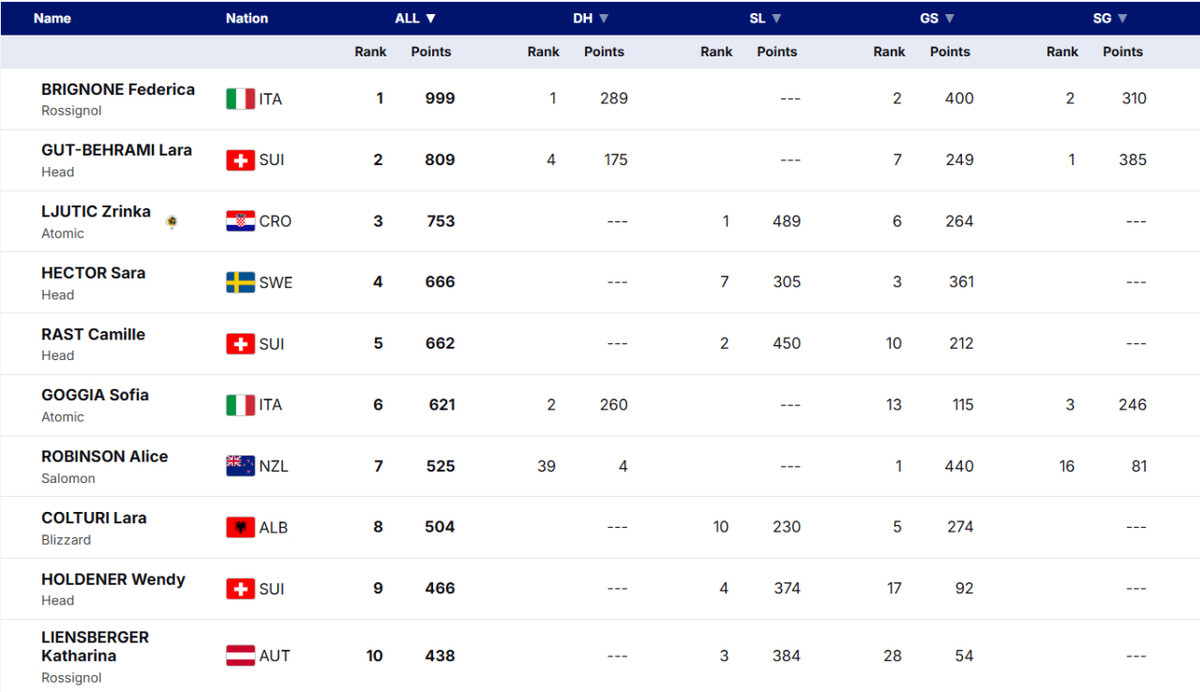Обидва рази на подіум в гіганті потрапила Еліс Робінсон, яка у поточному сезоні дуже стабільна: 7 подіумів у 8 стартах з урахуванням чемпіонату світу. Новозеландка проводить блискучий сезон і має прекрасні шанси на Малий Кубок світу в своїй коронній дисципліні, проте протистояти такій Бріньоне складно навіть їй.
