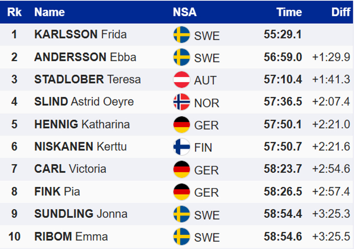 Жіночий масстарт на 20 км класикою на етапі Кубку світу в французькому Ле-Русс завершився подвійним успіхом збірної Швеції. Перемогу здобула Фріда Карлссон, другою з відставанням у 1 хвилину та 29 секунд фінішувала її партнерка по команді Ебба Андерссон.
