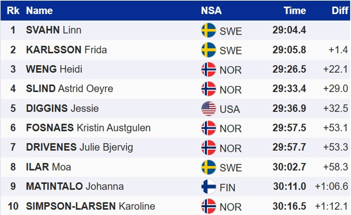 Сван усього на 1,4 секунди випередила свою партнерку по збірній Швеції, дворазову олімпійську чемпіонку Ігор-2026 Фріду Карлссон. Топ-3 замкнула норвежка Хейді Венг.