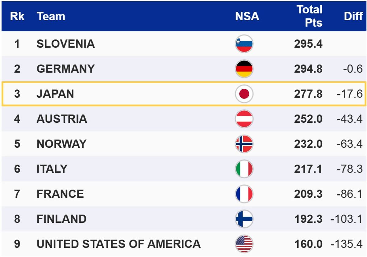 Топ-3 замкнула збірна Японії – Сара Таканасі, Рен Нікайдо, Нозомі Маруяма, Рьою Кобаясі. Змагання відбувалися за складних погодних умов, друга спроба була скасована. Збірна України у змішаному командному турнірі участі не брала.