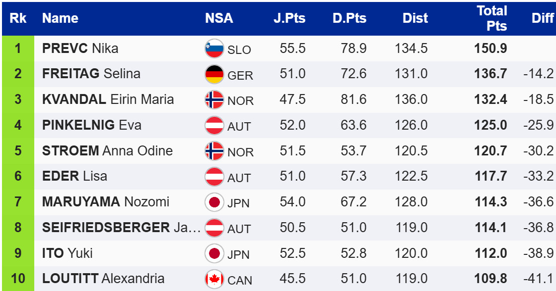 Сьогодні 19-річна Превц на 14,2 бала випередила німкеню Селіну Фрайтаг, яка завоювала срібло і на нормальному трампліні. Топ-3 замкнула господарка змагань, норвежка Айрін Марія Квандал.