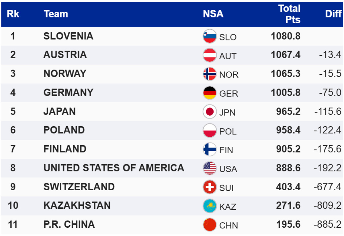 Команда у складі Ловро Коса, Домена Превца, Тімі Зайца та Анже Ланішека на 13,4 бала випередила австрійський квартет Даніель Чофеніг, Максімільян Ортнер, Штефан Крафт, Ян Хьорль. Словенії вдалося виграти командний турнір на чемпіонаті світу вдруге поспіль.
