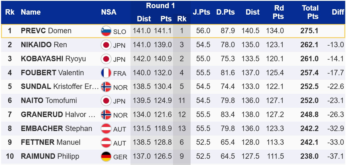 Превц-молодший знову розгромив суперників, випередивши найближчого переслідувача, японця Рена Нікайдо, на 13 балів. Топ-3 замкнув ще один представник Японії, Рьою Кобаясі. Ще один японець, Томофумі Наїто, замкнув топ-6.