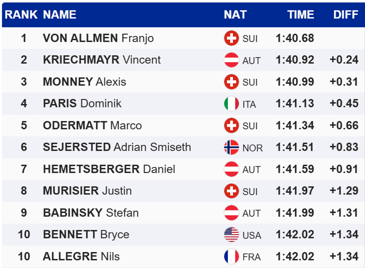 Срібло завоював господар змагань, австрієць Вінсент Кріхмайр, який у п’ятницю, 7 лютого, в супергіганті став четвертим. Топ-3 замкнув ще один представник Швейцарії, Алексіс Монне. Для нього, як і для фон Алльмена, це дебютний мундіаль у кар’єрі.
