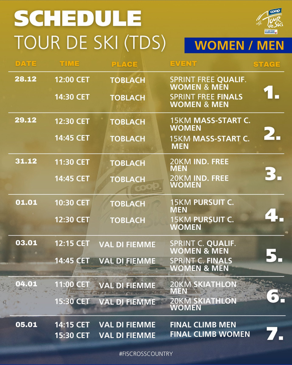 Цього року Тур де Скі вперше у своїй історії відбудеться на території лише однієї країни – Італії. Через це багато хто жартома вже пропонує перейменувати Тур де Скі на Джиро. Всі 7 етапів пройдуть у двох традиційних локаціях – Тоблаху та Валь ді Ф’ємме.
