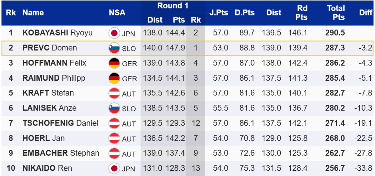 Кобаясі на 3,2 бали випередив чинного рекордсмена світу, словенця Домена Превца, який не зумів втримати лідерство після першої спроби. Топ-3 замкнув німець Фелікс Хоффманн, для якого це перший у кар'єрі подіум на Кубку світу.