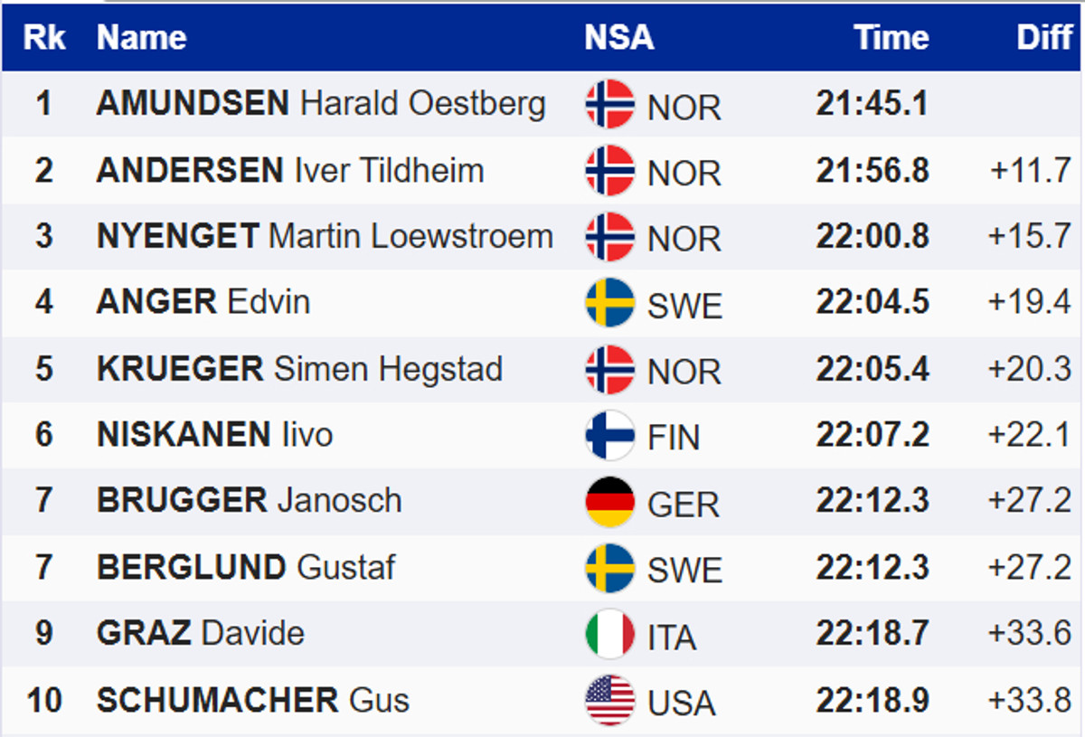 Перемогу здобув норвежець Харальд Остберг Амундсен, який випередив двох партнерів по команді – Івера Тільдхейма Андерсена та Мартіна Льовстрьома Ньєнгета.