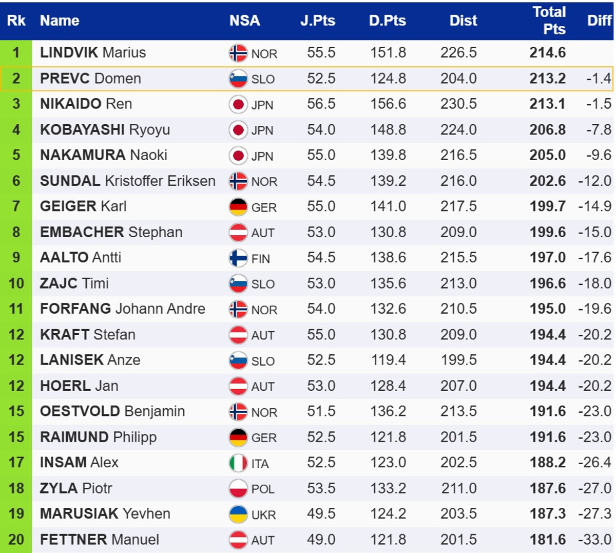 Лідерство захопив норвежець Маріус Ліндвік, який випереджає словенця Домена Превца та японця Рена Нікайдо.