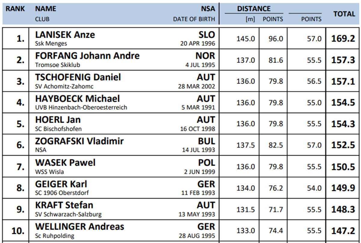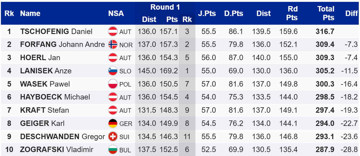 Після першої спроби з перевагою в 11,9 бала лідирує словенець Анже Ланішек. Він випереджає норвежця Йоханна Андре Форфанга та лідера загального заліку Кубку світу, Даніеля Чофеніга, який вчора разом з партнера по збірній Австрії виграв командний турнір.