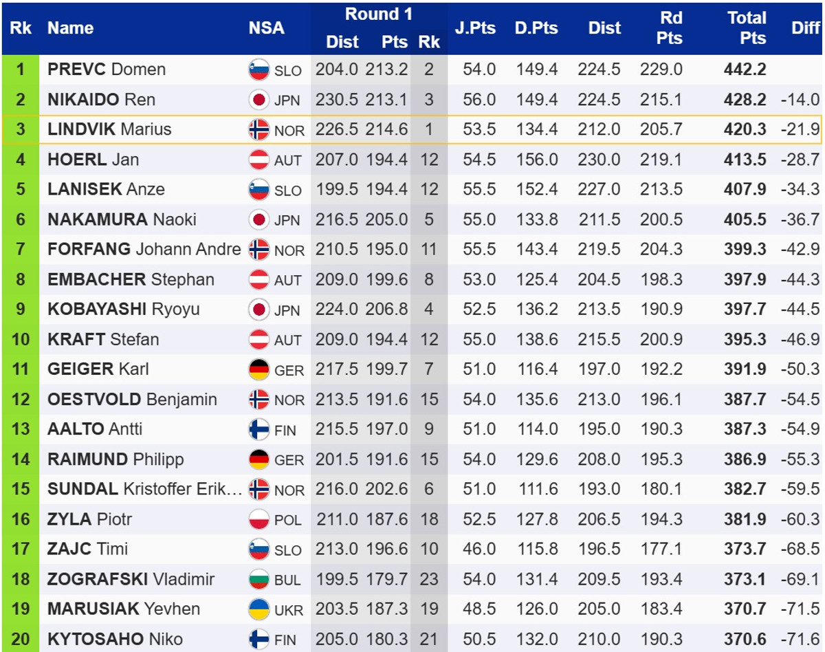 Лідирує після двох спроб словенець Домен Превц, який на 14 балів випереджає японця Рена Нікайдо. Топ-3 замикає норвежець Маріус Ліндвік.
