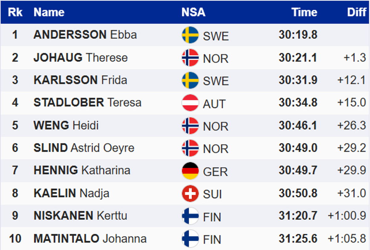 Своє перше золото Андерссон завоювала 2 березня в скіатлоні. Як і в неділю, шведка випередила легендарну норвежку Терезу Йохауг. Бронзу завоювала ще одна представниця Швеції, Фріда Карлссон.