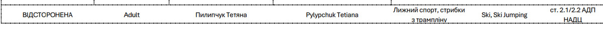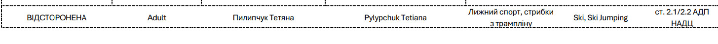 Національний антидопінговий центр (НАДЦ) оголосив про дискваліфікацію стрибунки з трампліна Тетяни Пилипчук строком на два роки.