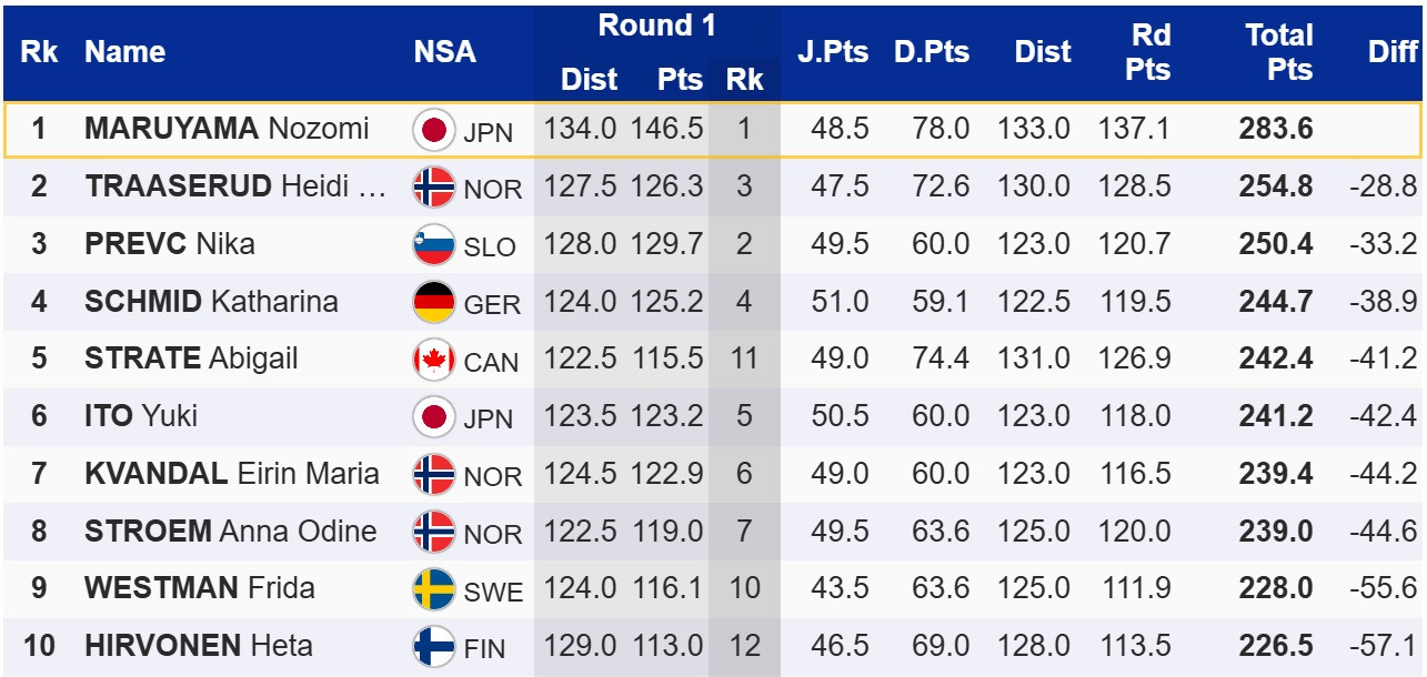 Другу перемогу поспіль здобула японка Нозомі Маруяма, яка випередила господарку змагань, норвежку Хейді Троссеруд, на 28,8 бала. Топ-3 із відставанням у 33,2 бала замкнула чинна володарка Кубку світу, словенка Ніка Превц.
