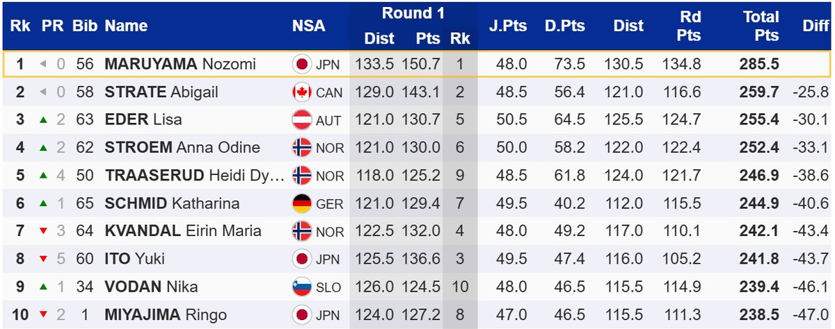 Розгромну перемогу здобула японка Нозомі Маруяма, яка на 25,8 бала випередила найближчу переслідувачку, канадку Ебігейл Стрейт. Топ-3 замкнула австрійка Ліза Едер. Чинна володарка Кубку світу, словенка Ніка Превц, посіла лише 15 місце.